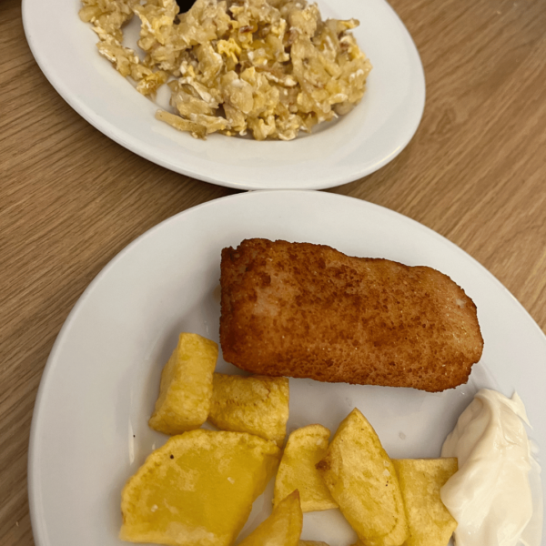 At Super Frango in Ayamonte, a whole chicken costs 8 euros (2024), and you can get it with fries or rice. There are also cold cuts in the display cases and the popular Portuguese pastries, Pastel de Nata. There’s only take-away for lunch, but the place is still highly loved by the locals, especially on Sundays when the line is long.